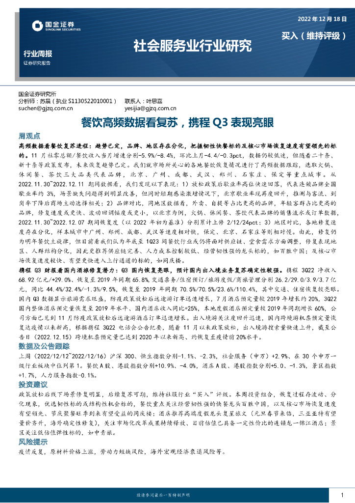 国金证券:社会服务业行业研究:餐饮高频数据看复苏,携程Q3表现亮眼.pdf