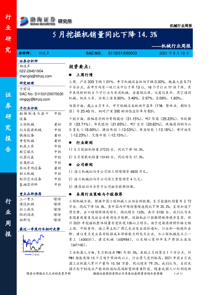 渤海证券:机械行业周报:5月挖掘机销量同比下降14.3%.pdf