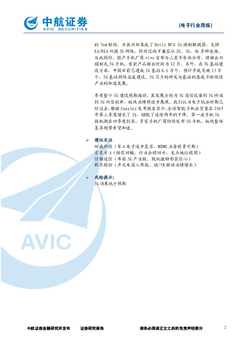 中航证券:电子行业周报:5G双模芯片出现新格局,看好板块整体复苏.pdf