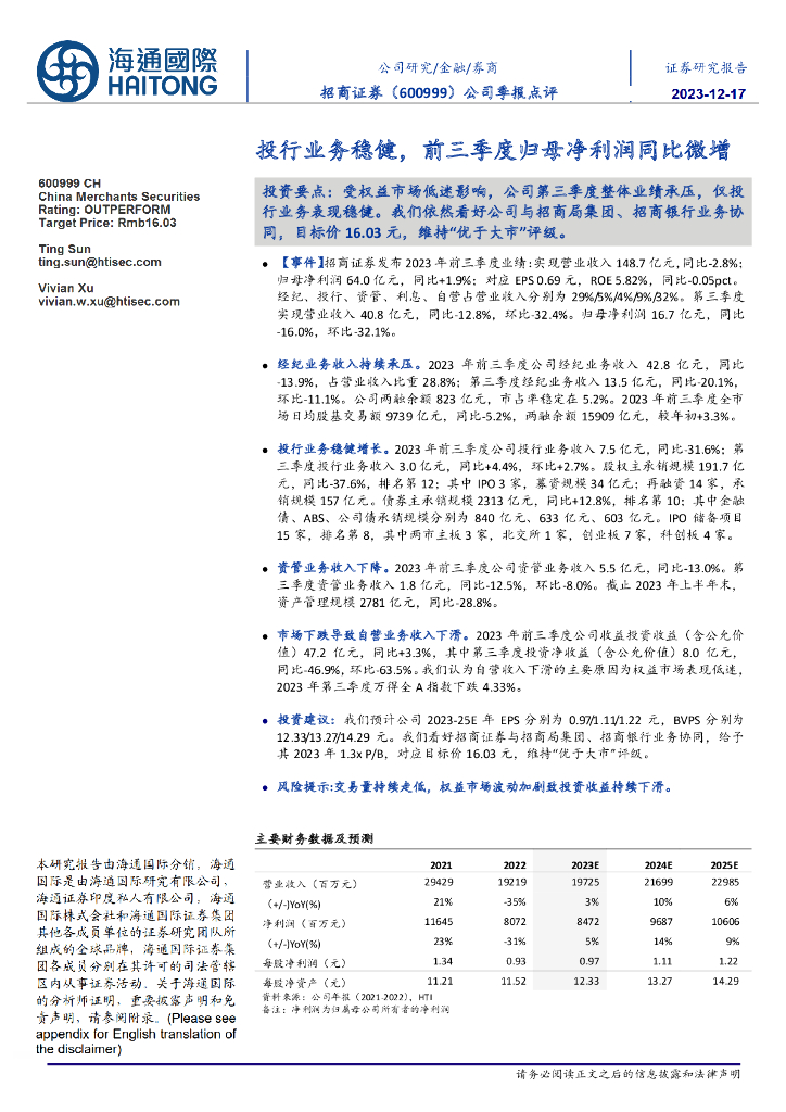 海通国际:招商证券(600999)-公司季报点评:投行业务稳健,前三季度归母净利润同比微增.pdf