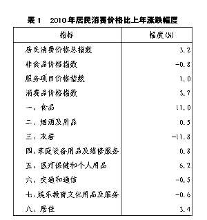 表1 2010年居民消费价格上年涨跌幅度