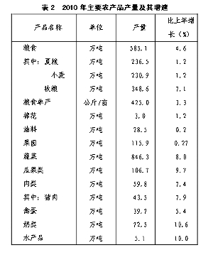 表2 2010年主要农产品产量及其增速