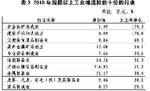 表3 2010年规模以上工业增速排前十位的行业