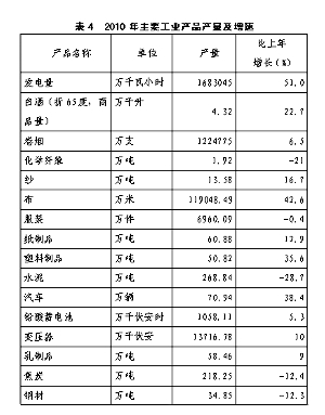 表4 2010年主要工业产品产量及增速