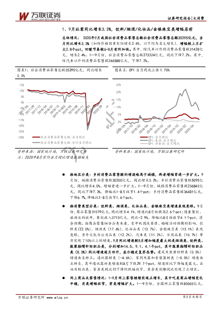 万联证券:2020年9月社会消费品零售数据点评:9月社零同比增长3.3%,饮料/烟酒/化妆品/珠宝类增幅居前.pdf