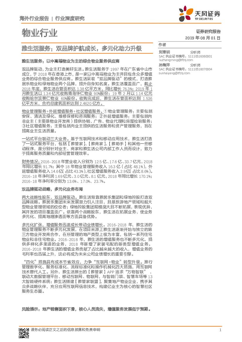 天风证券:物业行业深度研究:雅生活服务:双品牌护航成长,多元化助力升级.pdf