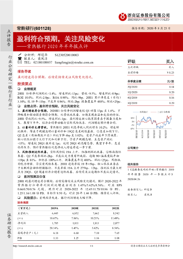浙商证券:常熟银行2020年半年报点评:盈利符合预期,关注风险变化.pdf