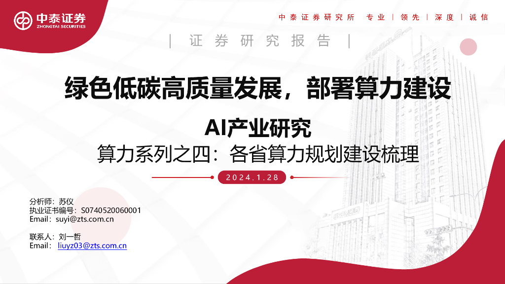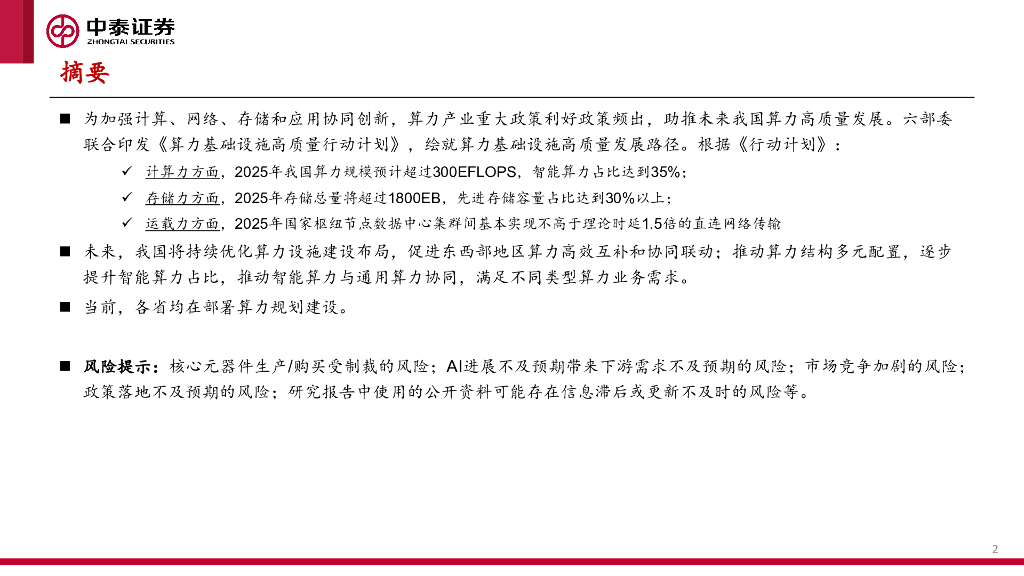 中泰证券:算力系列之四:各省算力规划建设梳理:绿色低碳高质量发展,部署算力建设AI产业研究.pdf