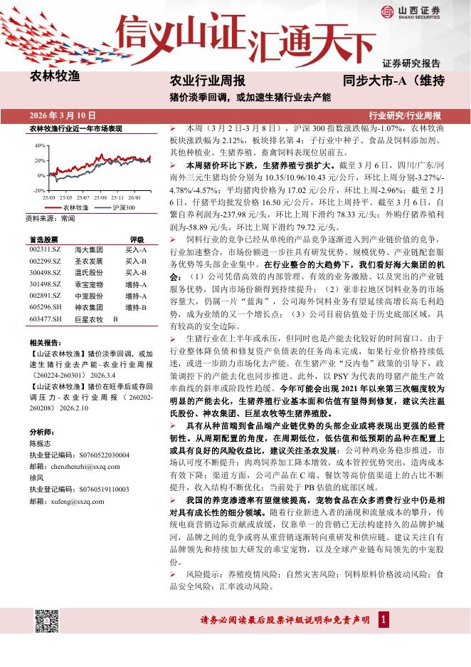 山西证券:农业行业周报:猪价淡季回调,或加速生猪行业去产能.pdf
