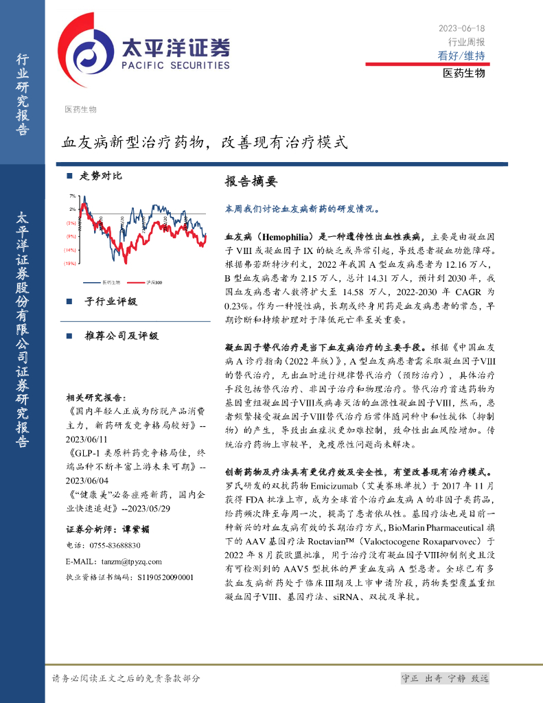 太平洋证券:医药生物行业周报:血友病新型治疗药物,改善现有治疗模式.pdf