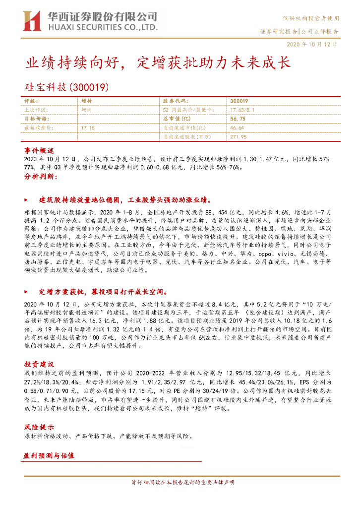 华西证券:硅宝科技(300019)-业绩持续向好,定增获批助力未来成长.pdf
