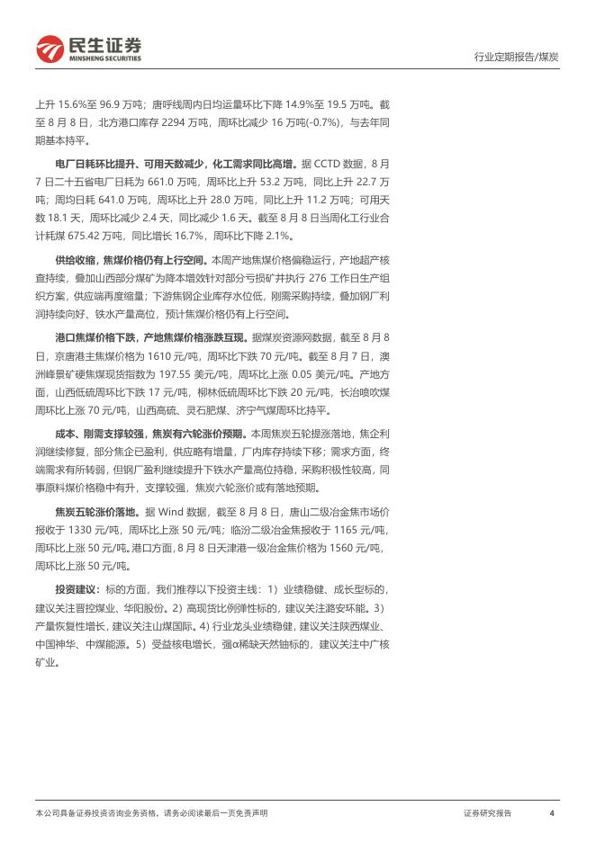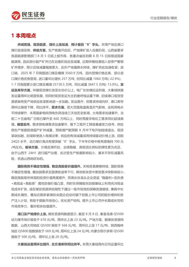 民生证券:煤炭周报:供减需强、现货趋紧,煤价上涨加速,预计重回“8”字头.pdf