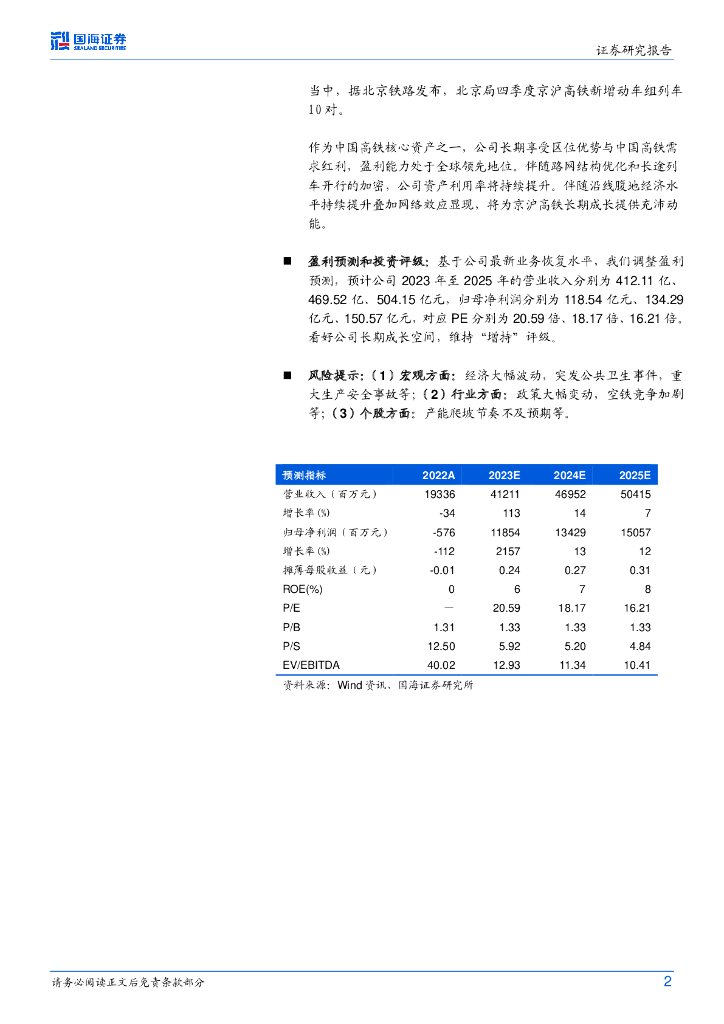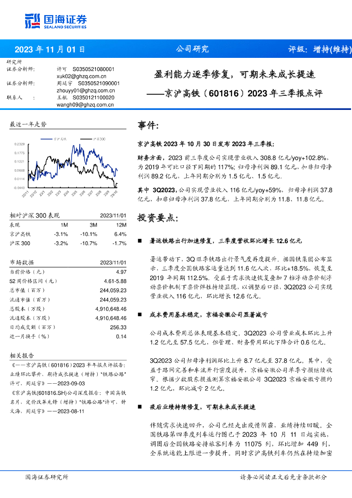 国海证券:京沪高铁(601816)-2023年三季报点评:盈利能力逐季修复,可期未来成长提速.pdf