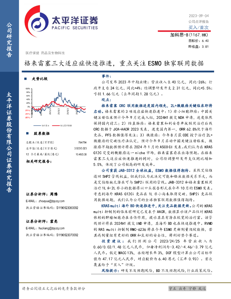 太平洋证券:加科思-B(01167)港股公司研究报告-格来雷塞三大适应症快速推进,重点关注ESMO独家联用数据.pdf