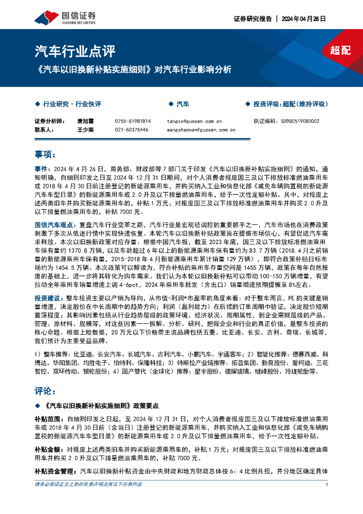 国信证券:汽车行业点评:《汽车以旧换新补贴实施细则》对汽车行业影响分析.pdf