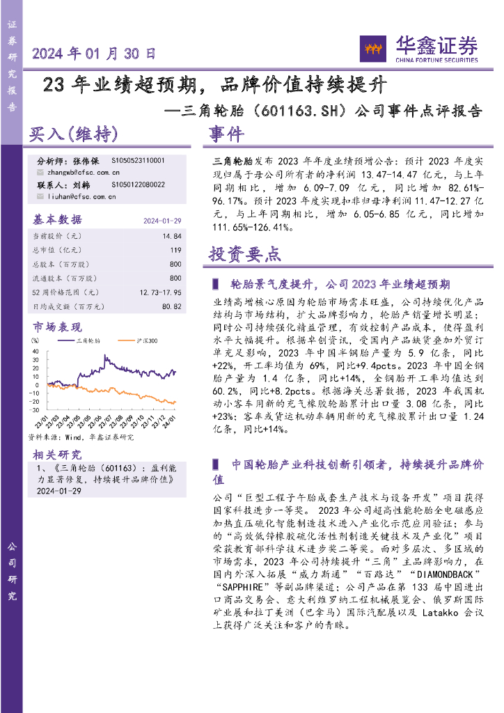 华鑫证券:三角轮胎(601163)-公司事件点评报告:23年业绩超预期,品牌价值持续提升.pdf