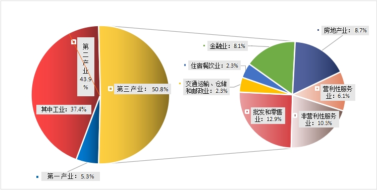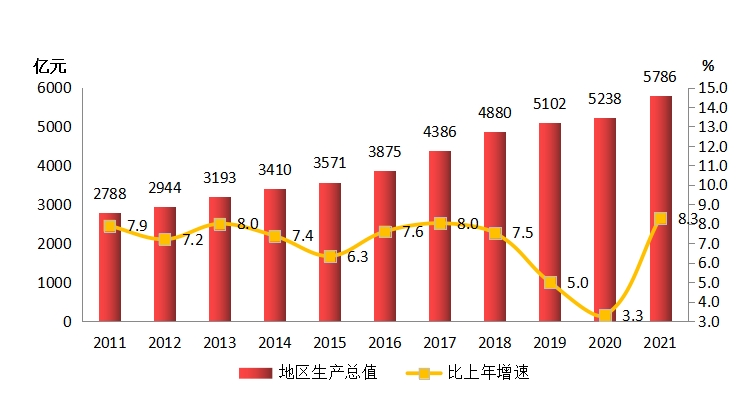 经济运行稳中有进。经初步核算,2021年,全市实现生产总值〔1〕5786.19亿元,按可比价格计算,比上年增长8.3%。其中,第一产业增加值303.94亿元,增长2.0%;第二产业增加值2543.01亿元,增长9.3%;第三产业增加值2939.24亿元,增长8.1%;三次产业结构为5.3:43.9:50.8。市区实现生产总值2056.28亿元,比上年增长7.0%。经最终核实,2020年,台州市生产总值现价总量为5238.39亿元,比上年增长3.3%;三次产业增加值结构为5.6∶43.5∶50.9。