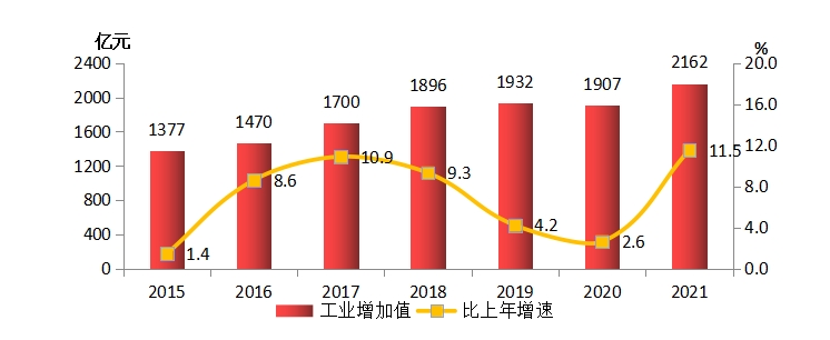 工业生产整体平稳。全市实现工业增加值2162.34亿元,比上年增长11.5%。全市规模以上工业企业(年主营业务收入2000万元及以上工业企业)4692家,实现工业增加值1453.90亿元,比上年增长12.4%。