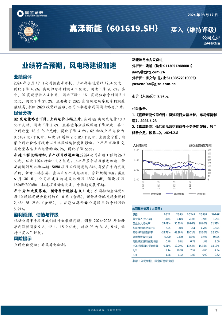 国金证券:嘉泽新能(601619)-业绩符合预期,风电场建设加速.pdf