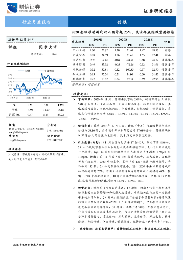 财信证券:传媒行业月度报告:2020全球移动游戏收入预计超25%,关注年底院线重要档期.pdf