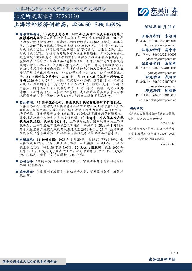 东吴证券:北交所定期报告:上海涉外经济创新高,北证50下跌1.69%-260130.pdf