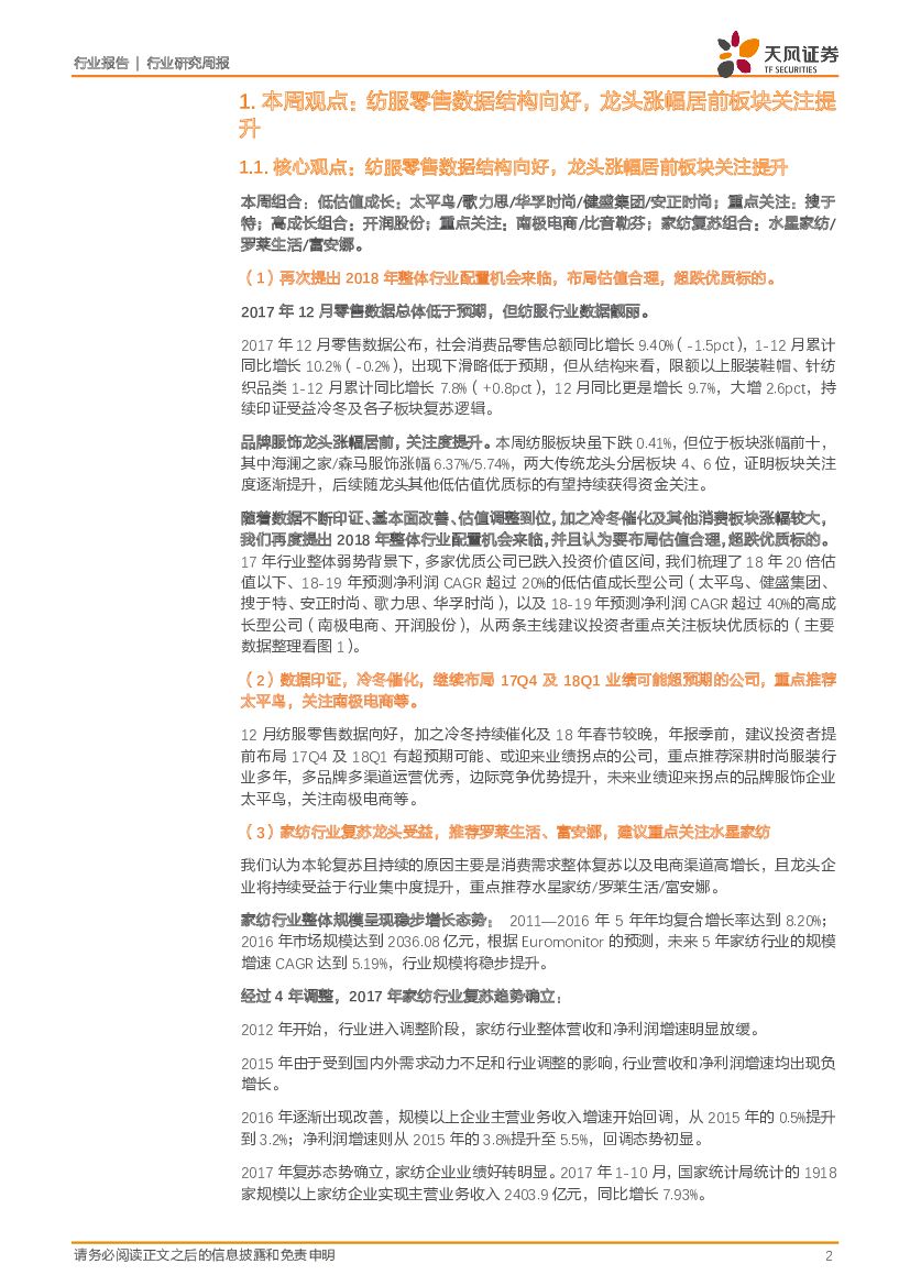 天风证券:纺织服装行业研究周报:纺服零售数据结构向好,龙头涨幅居前板块关注提升.pdf