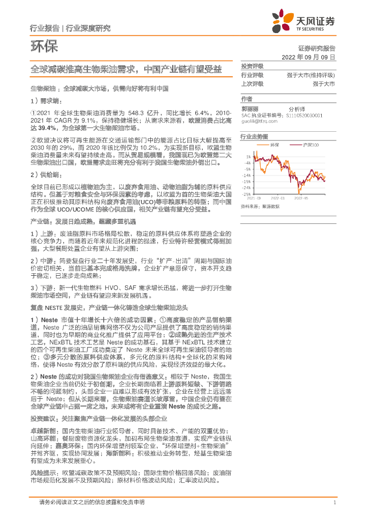 天风证券:环保行业深度研究:全球减碳推高生物柴油需求,中国产业链有望受益.pdf