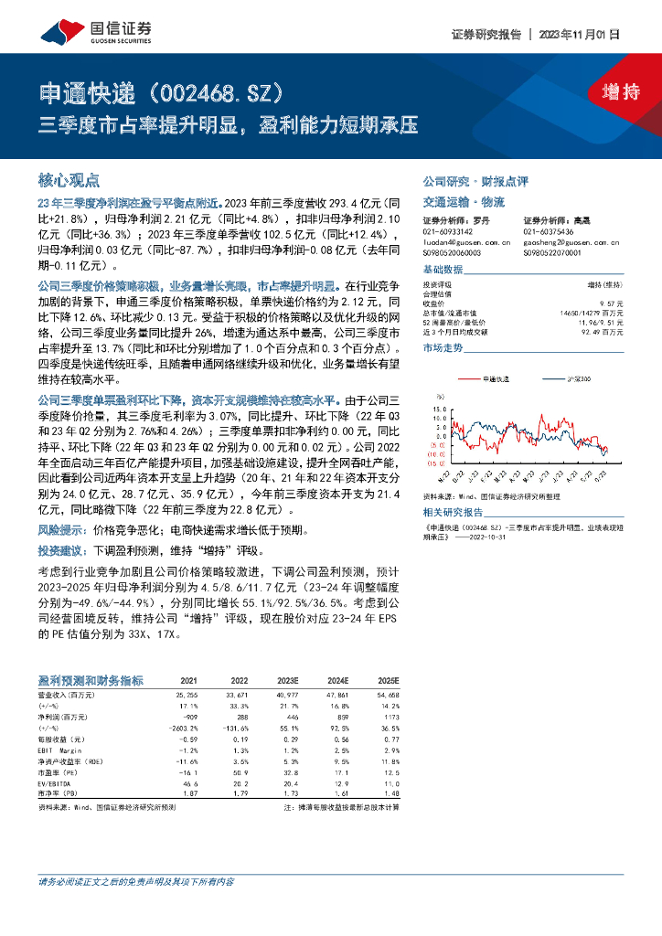 国信证券:申通快递(002468)-三季度市占率提升明显,盈利能力短期承压.pdf