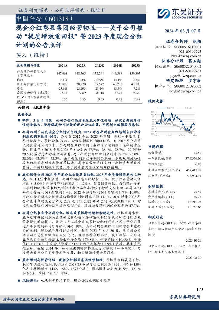 东吴证券:中国平安(601318)-关于公司推动“提质增效重回报”暨2023年度现金分红计划的公告点评:现金分红彰显集团经营韧性.pdf