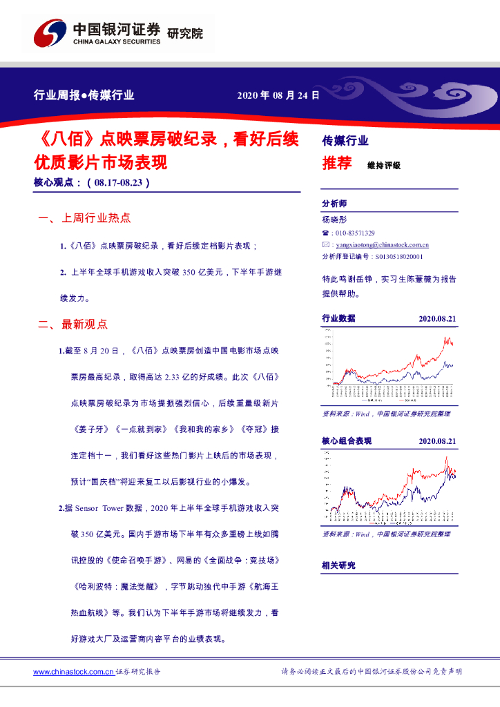 中国银河:传媒行业周报:《八佰》点映票房破纪录,看好后续优质影片市场表现.pdf