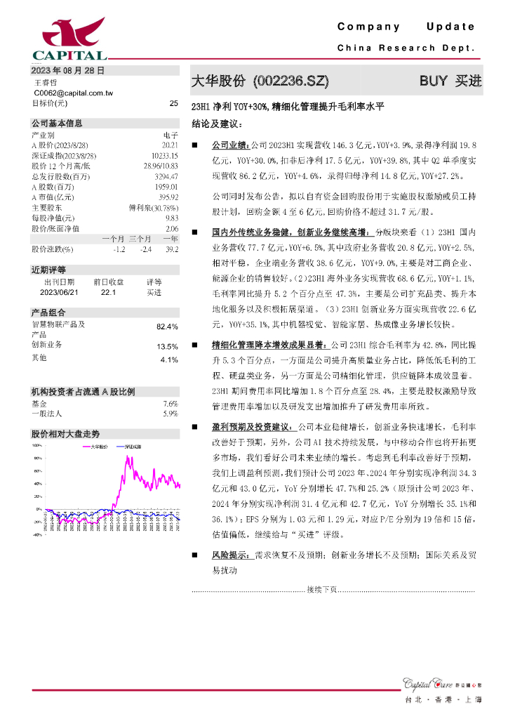 群益证券:大华股份(002236)-23H1净利YOY+30%,精细化管理提升毛利率水平.pdf