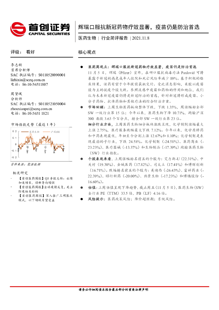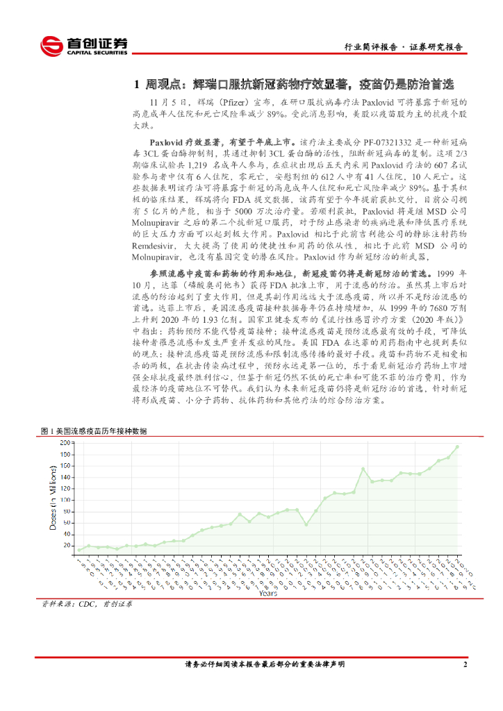 首创证券:医药生物行业简评报告:辉瑞口服抗新冠药物疗效显著,疫苗仍是防治首选.pdf
