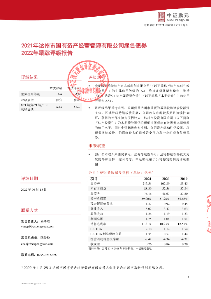 鹏元:2021年达州市国有资产经营管理有限公司绿色债券2022年跟踪评级报告.pdf