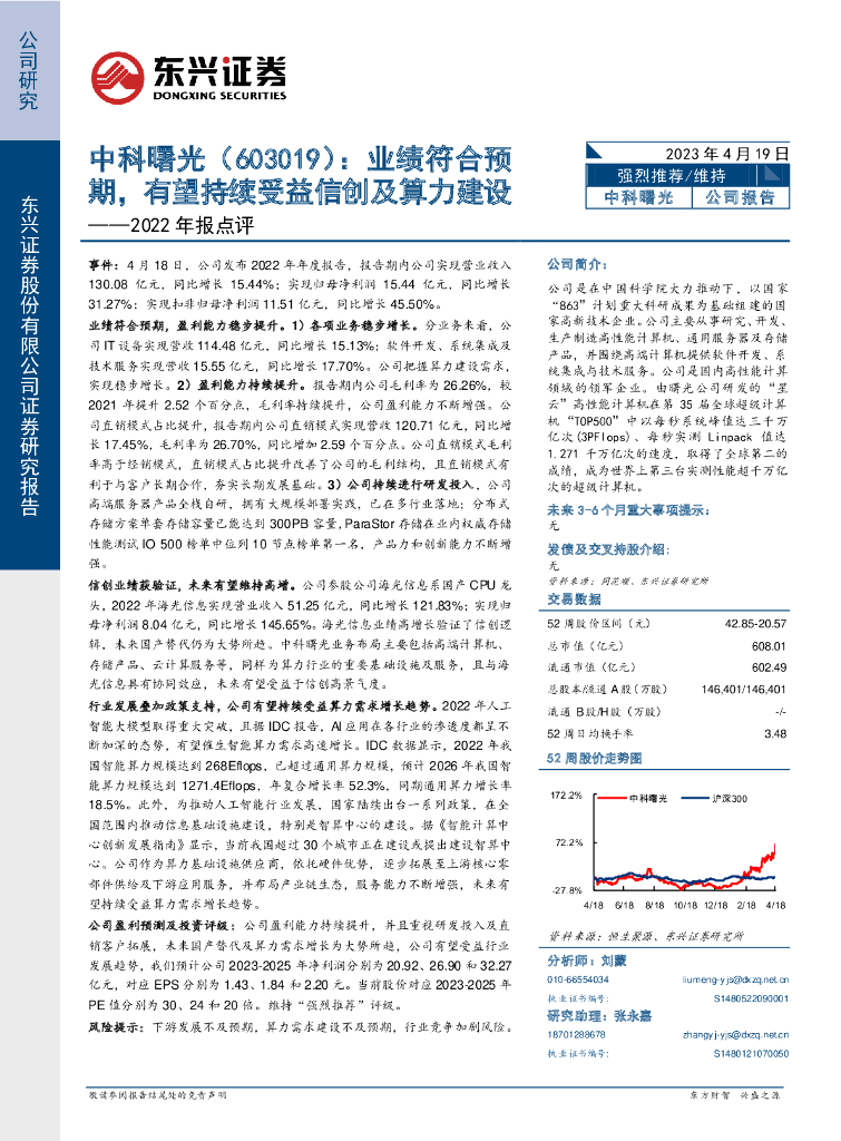 东兴证券:中科曙光(603019)-2022年报点评:业绩符合预期,有望持续受益信创及算力建设.pdf