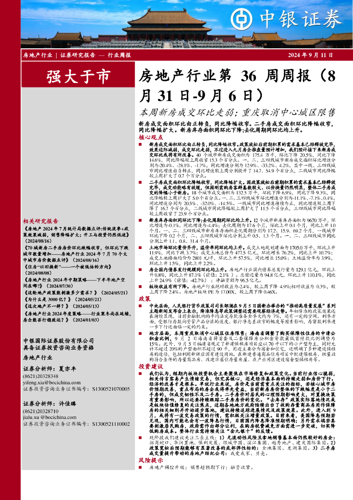中银证券:房地产行业第36周周报:本周新房成交环比走弱;重庆取消中心城区限售.pdf