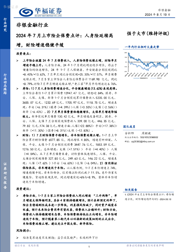 华福证券:非银金融行业2024年7月上市险企保费点评:人身险延续高增,财险增速稳健平缓.pdf