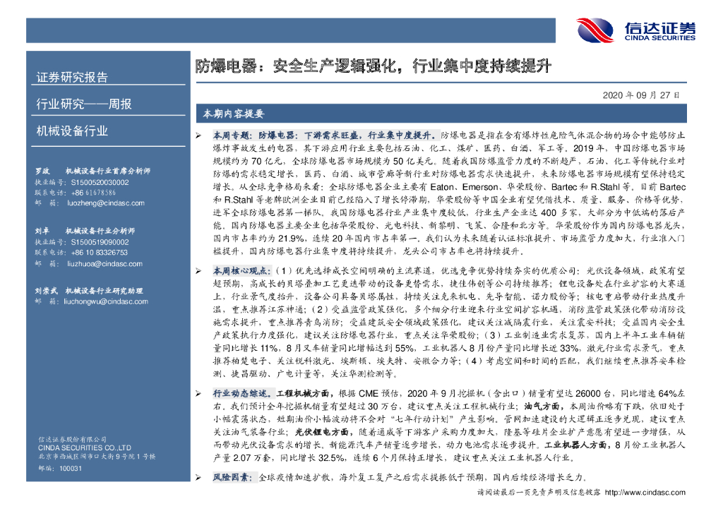 信达证券:机械设备行业周报-防爆电器:安全生产逻辑强化,行业集中度持续提升.pdf