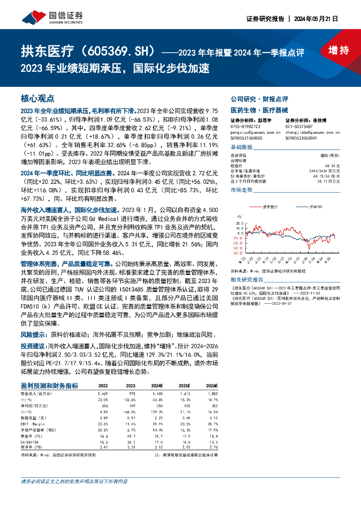 国信证券:拱东医疗(605369)-2023年年报暨2024年一季报点评:2023年业绩短期承压,国际化步伐加速.pdf