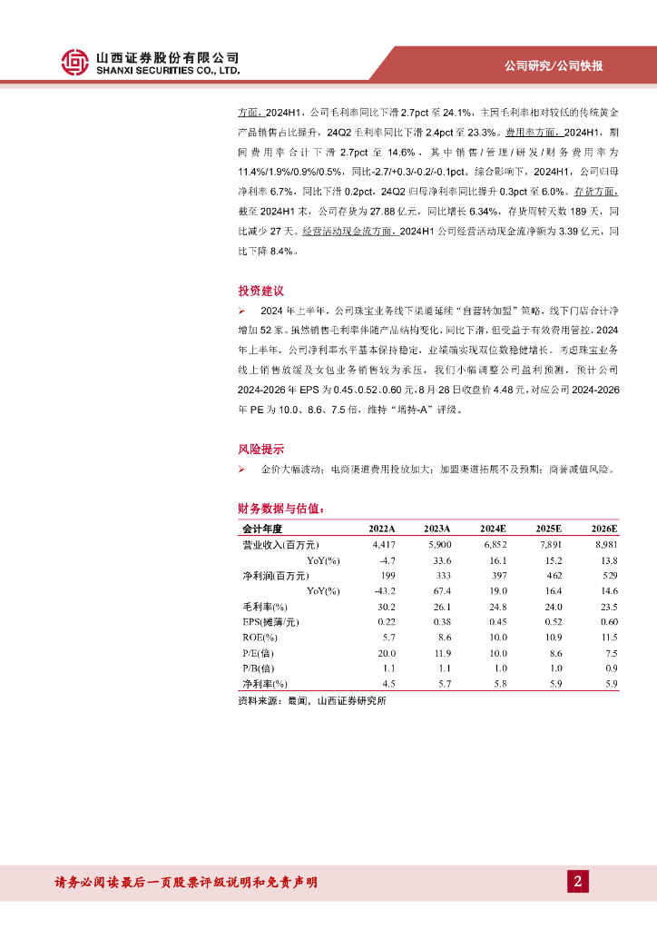 山西证券:潮宏基(002345)-2024H1营收实现稳健增长,盈利水平基本保持稳定公司研究/公司快报.pdf