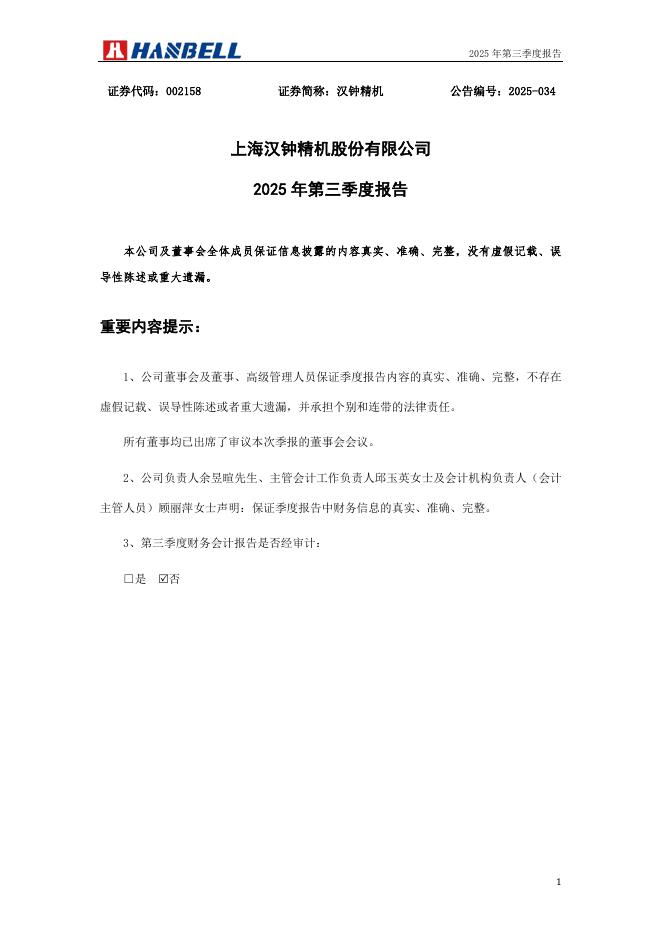 002158-汉钟精机:2025年三季度报告.pdf