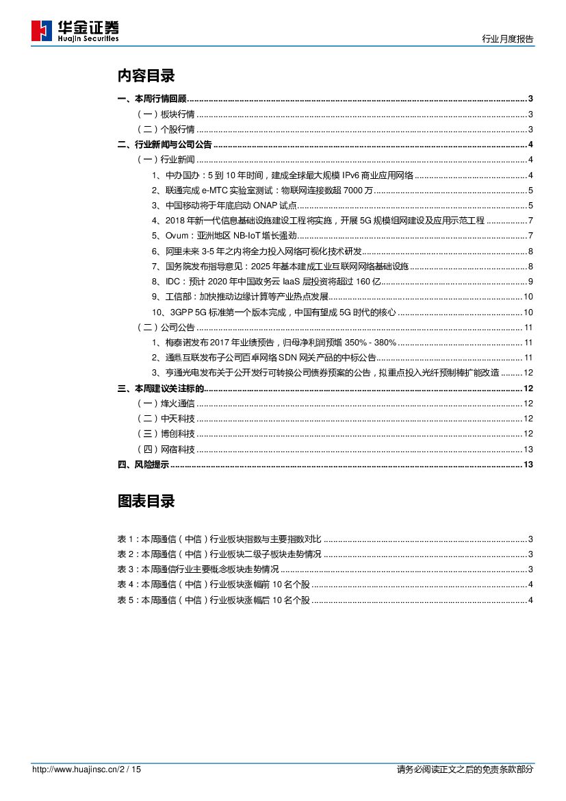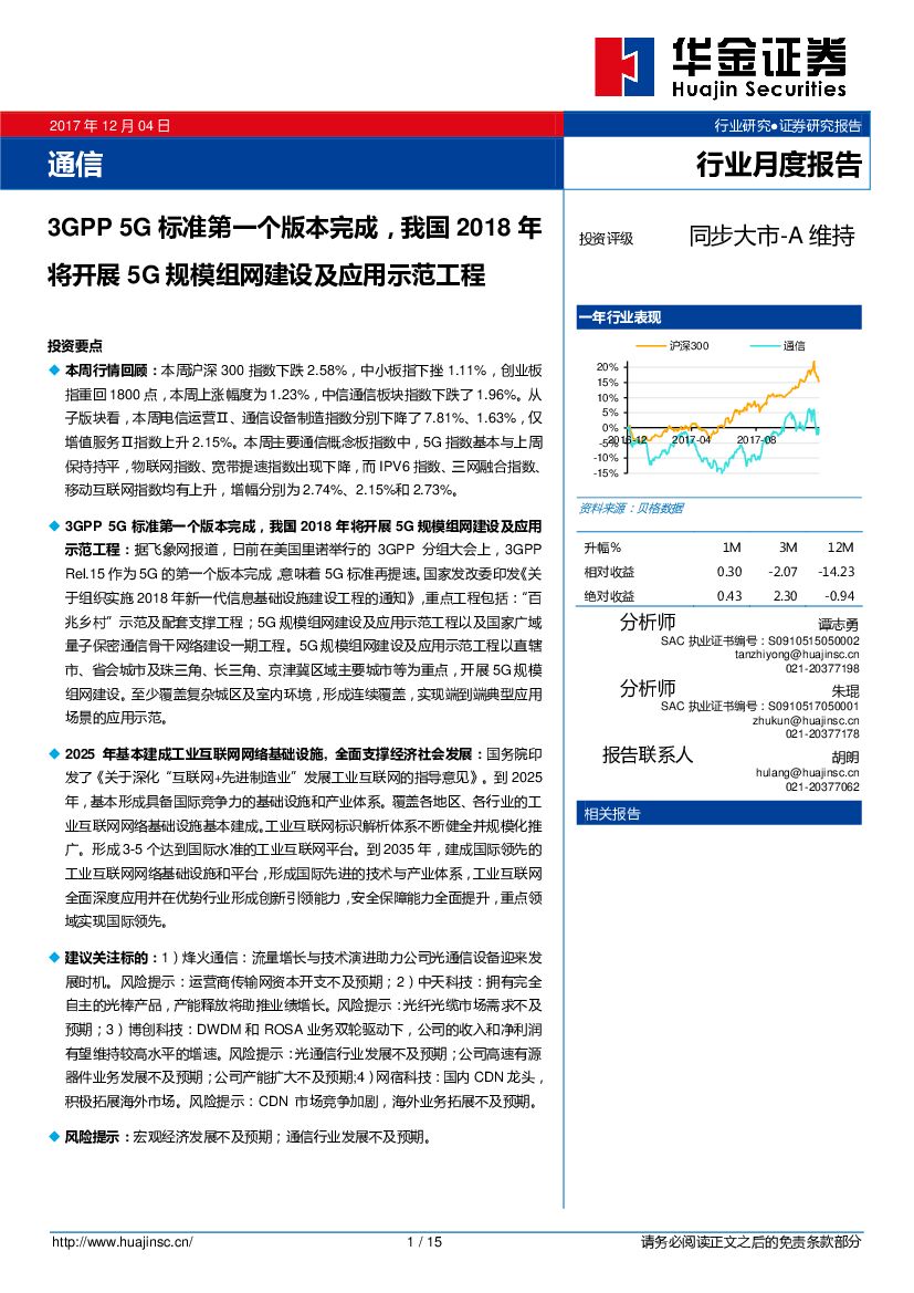 华金证券:通信行业月度报告:3GPP 5G标准第一个版本完成,我国2018年将开展5G规模组网建设及应用示范工程.pdf