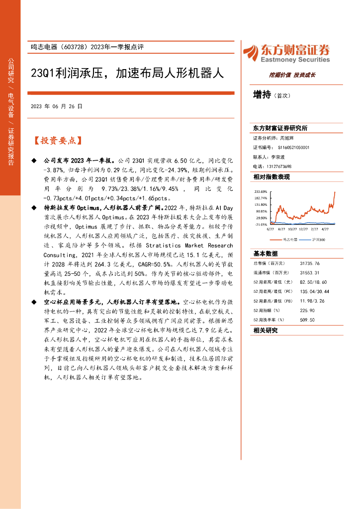 东方财富证券:鸣志电器(603728)-2023年一季报点评:23Q1利润承压,加速布局人形机器人.pdf