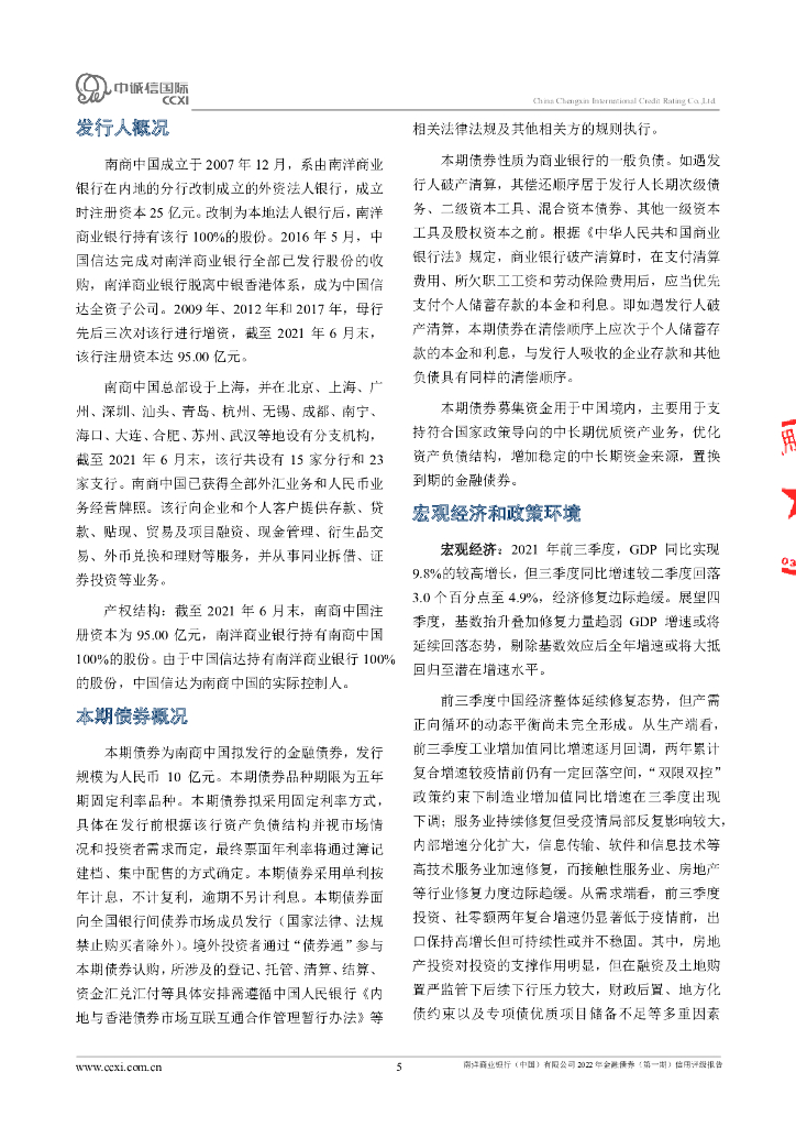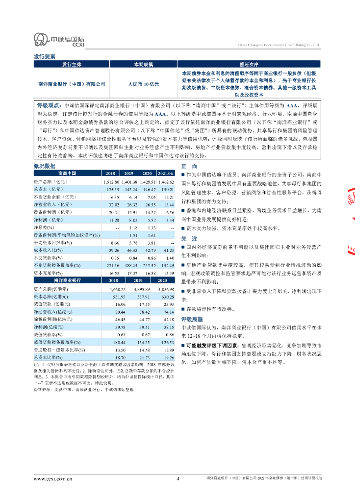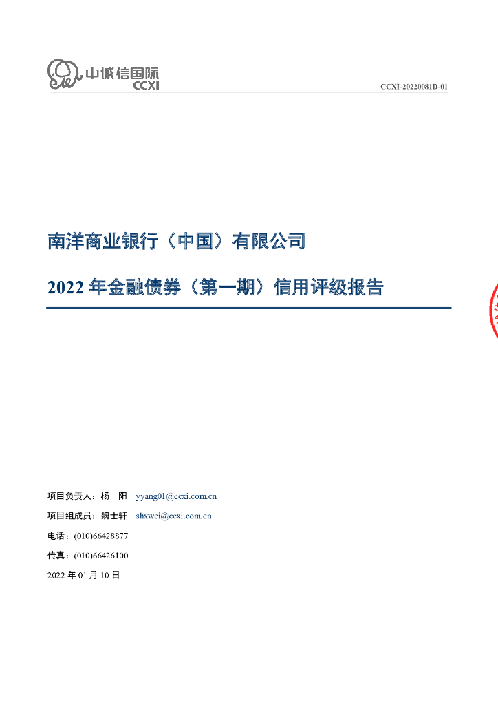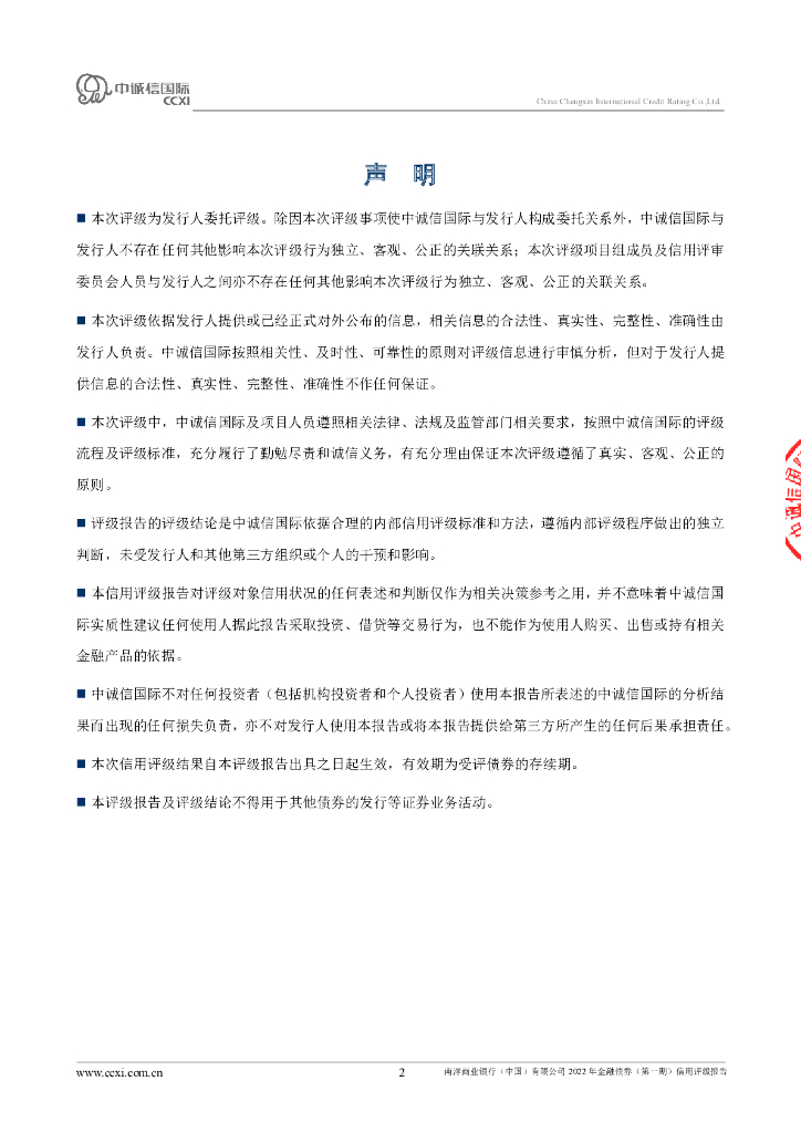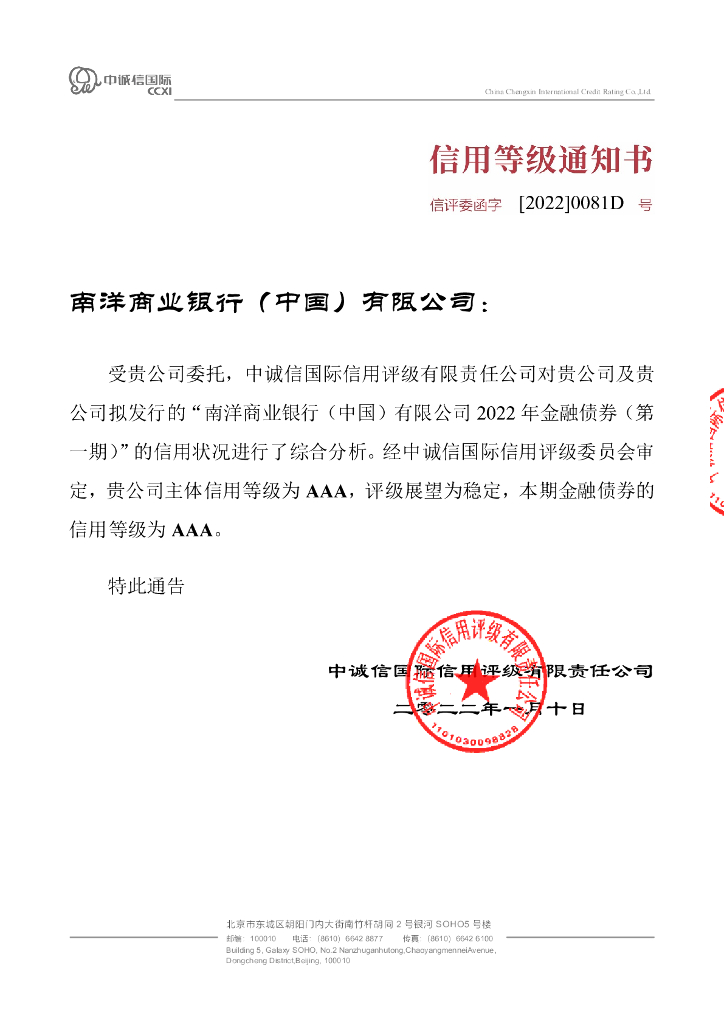 中诚信:南洋商业银行(中国)有限公司2022年金融债券(第一期)信用评级报告及跟踪评级安排.pdf