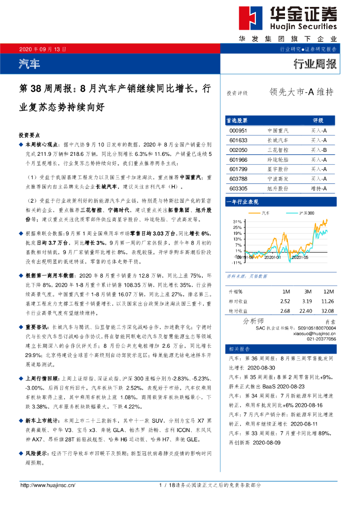 华金证券:汽车行业第38周周报:8月汽车产销继续同比增长,行业复苏态势持续向好.pdf