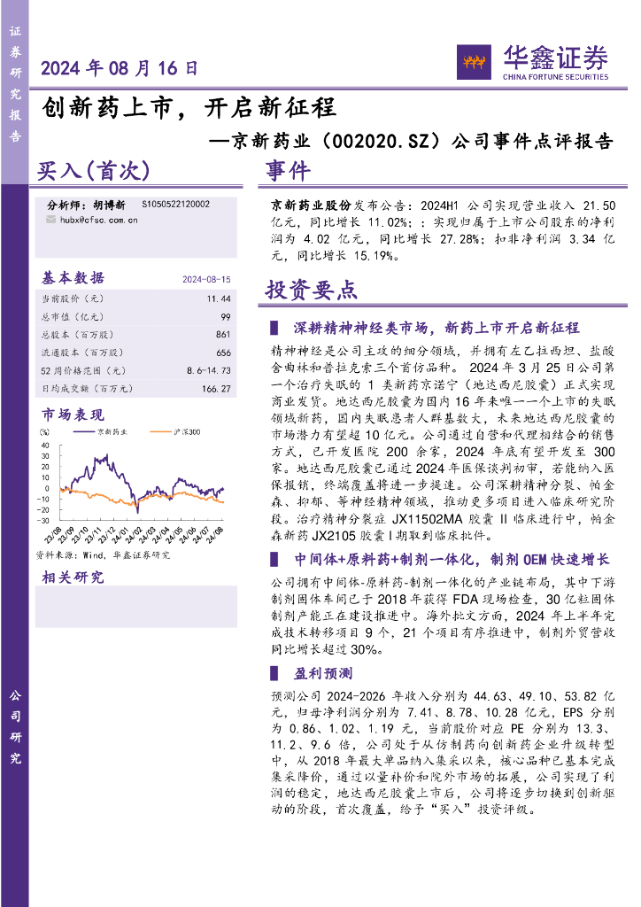 华鑫证券:京新药业(002020)-公司事件点评报告:创新药上市,开启新征程.pdf