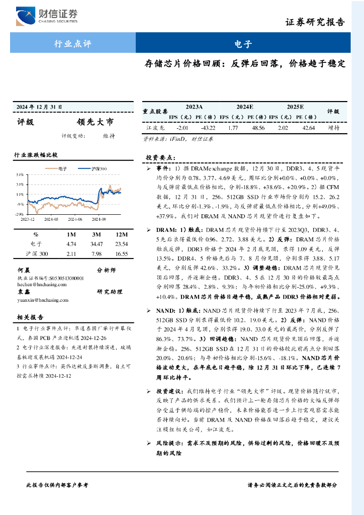 财信证券:电子行业点评:存储芯片价格回顾:反弹后回落,价格趋于稳定.pdf