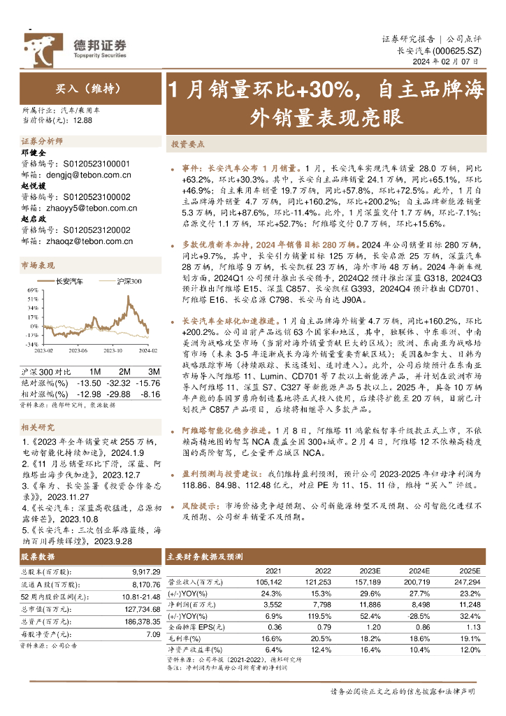 德邦证券:长安汽车(000625)-1月销量环比+30%,自主品牌海外销量表现亮眼.pdf