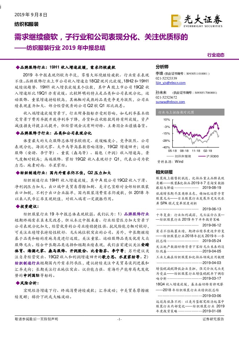 光大证券:纺织服装行业2019年中报总结:需求继续疲软,子行业和公司表现分化、关注优质标的.pdf