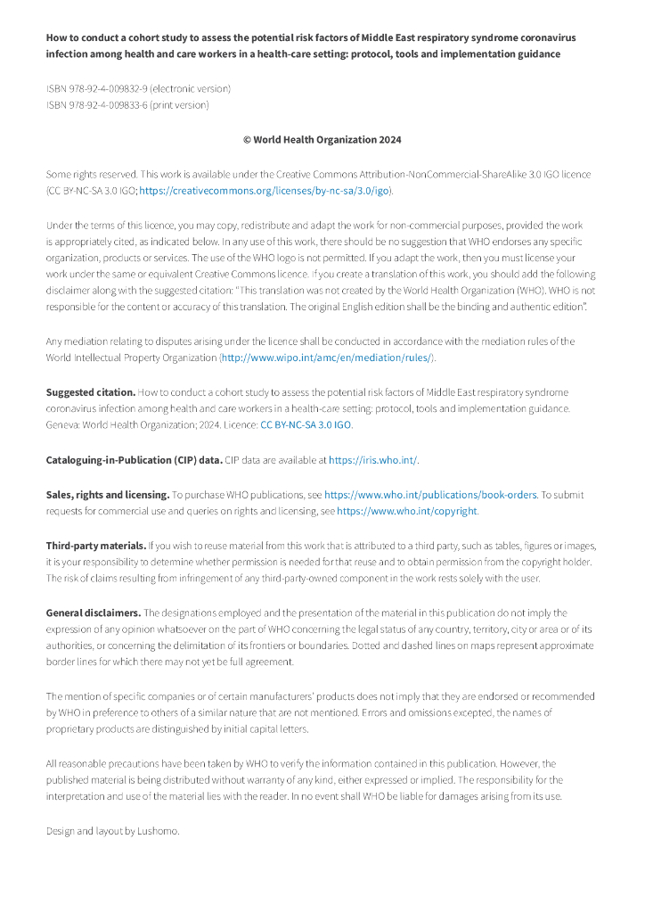 WHO世界卫生组织:2024年如何进行队列研究以评估医疗机构中医护人员感染中东呼吸综合征冠状病毒的潜在危险因素报告(英文版).pdf