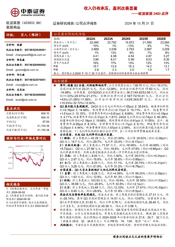 中泰证券:欧派家居24Q3点评:收入仍有承压,盈利改善显著.pdf